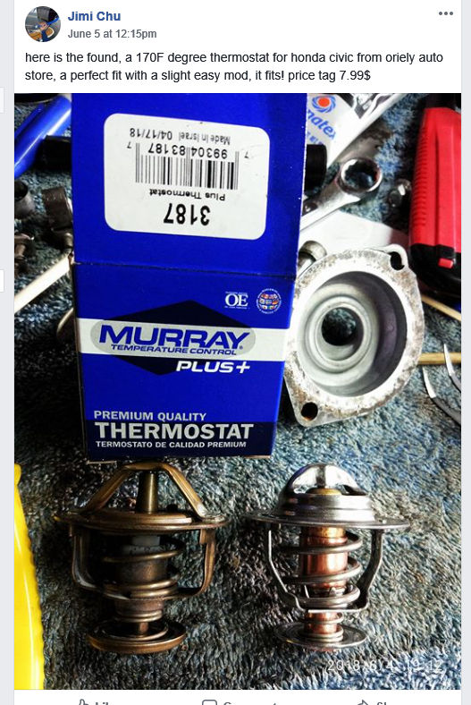 I've been using a thermostat from a car for years.Don't remember what model. But all i had to do was file down the diameter of the large flat plate portion so that it would fit into the hole. Seems to work fine.
