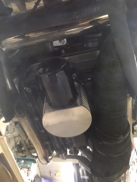 The oil temp. is kept under control in 2 ways. The "shield" and my oil cooler/spin-on adapter ( picture of my previous exhaust system with "wrap".)