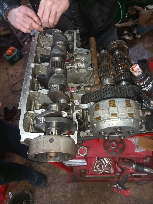 I found it much easier putting the pistons in the bores, securing the barrels to the top case and then lowering the crank over all the rods together. I had 2 friends help but it was easier than getting 18 rings into the barrels the conventional way.