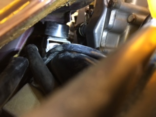 That hose was one of the first things we checked, but it is not the culprit. My Geometry teaching wife and I have tried repeatedly today to get the thing on, and it just won't fit. She took several pictures and asked that I post them and get suggestions from you guys. With the two rubber pucks near the 'U" cups under the tank, it seems the tank is too wide, sitting too close to the neck, and the last picture has a light shining where the bottom of the tank is rubbing the frame.