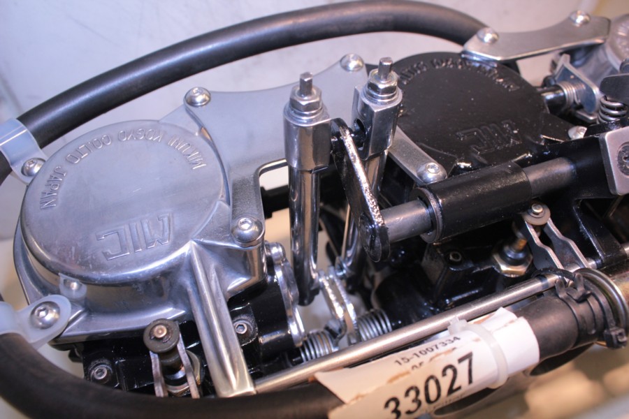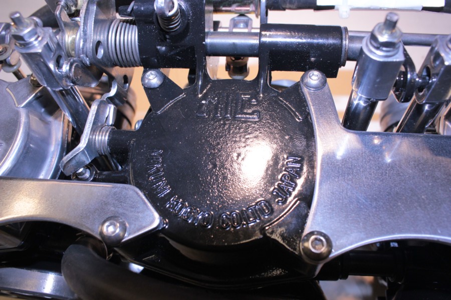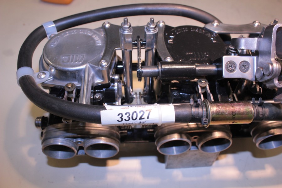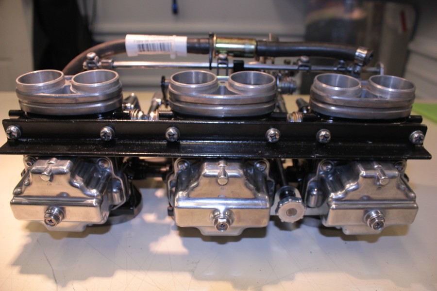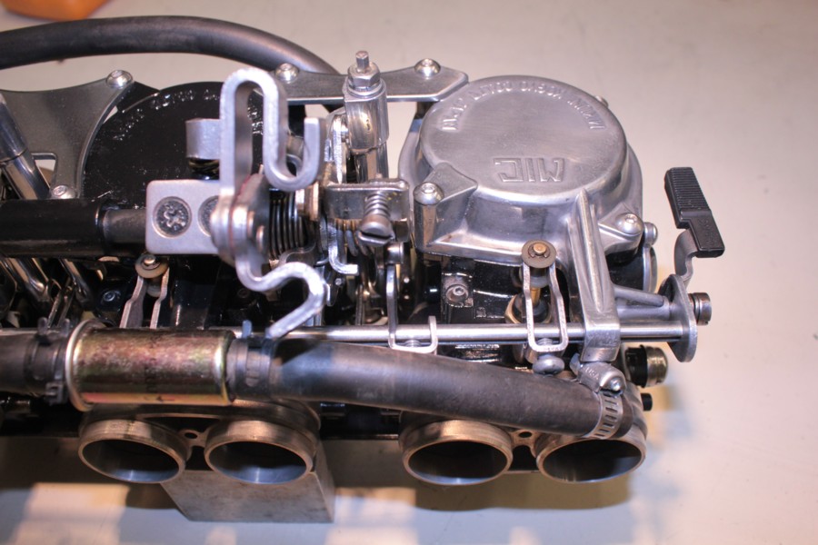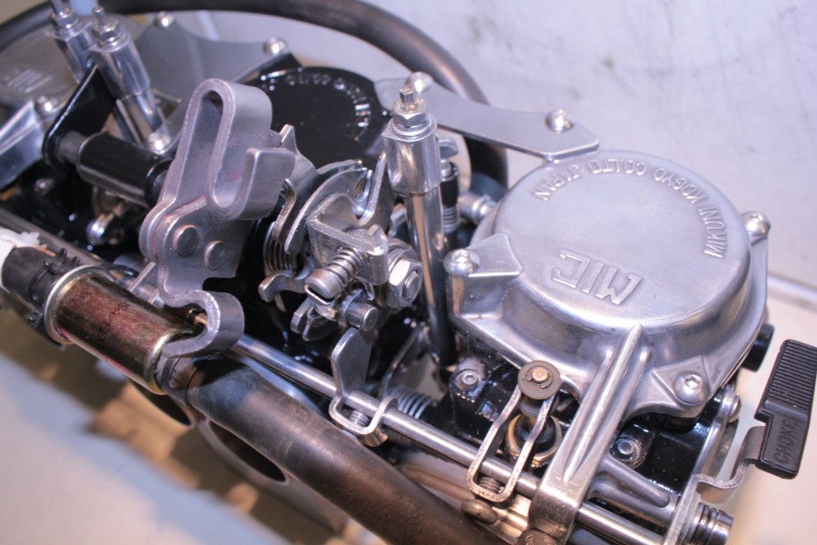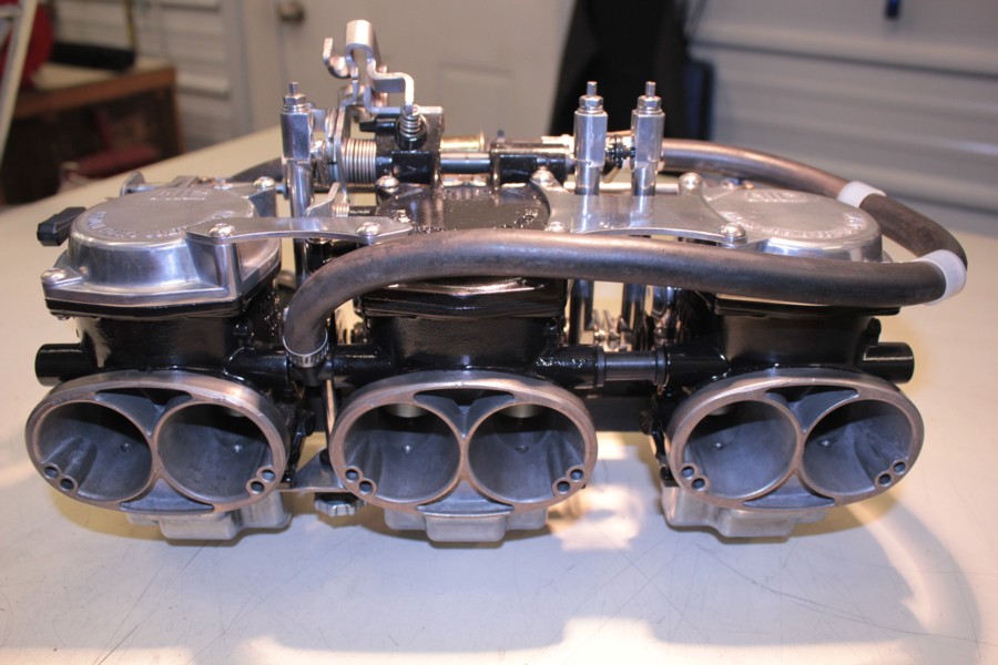 The 3 fuel-bowls, L & R top covers, linkage rods, idle adjustment rod and bottom retainer, two top joiner plates and 3 fuel-enriching covers have been cleaned to a good bright finish, ready to proceed with further polishing if desired. The three bodies have a high luster fine "wrinkle" finish.