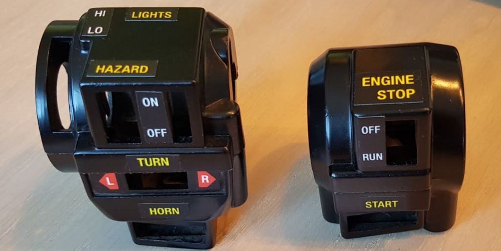 I have now available stickers to recreate the faded original texts on the switch bodies. The stickers are of weatherproof vehicle grade vinyl and will enhance the looks of your bike. For best results, clear cote over the stickers.