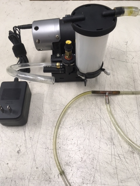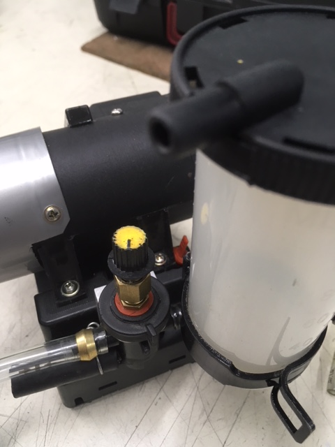The pump will draw down to 20" Hg. Not shown is a vacuum gauge I connect, to adjust the Yellow knob which is a needle-valve that controls the vacuum. 1.5"HG to 2" Hg vacuum, is the best range to remove fluid/air, but not so fast I loose the reservoir, too quickly. When the last of the air is drawn out I keep the pump running, shut off the bleeder nipples, then turn off the pump.