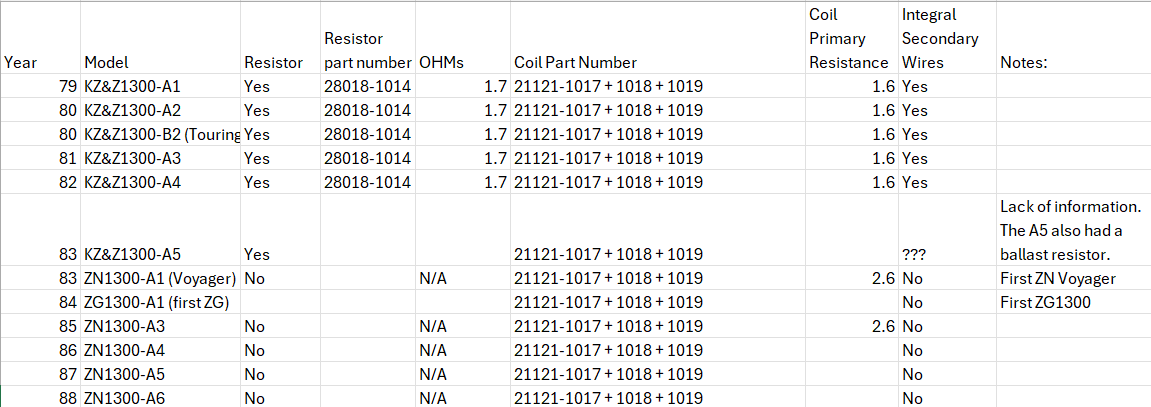 Starting with model year '83 the ZNs and possibly the ZGs substituted a different ignition coil without changing the part number. This new coil is labled "ZC006-TR12V" and measures 2.6 OHMs primary resistance. No ZNs and I speculate that none of the ZGs use a ballast resistor. (Need some help. Any ZG owners in the room?)