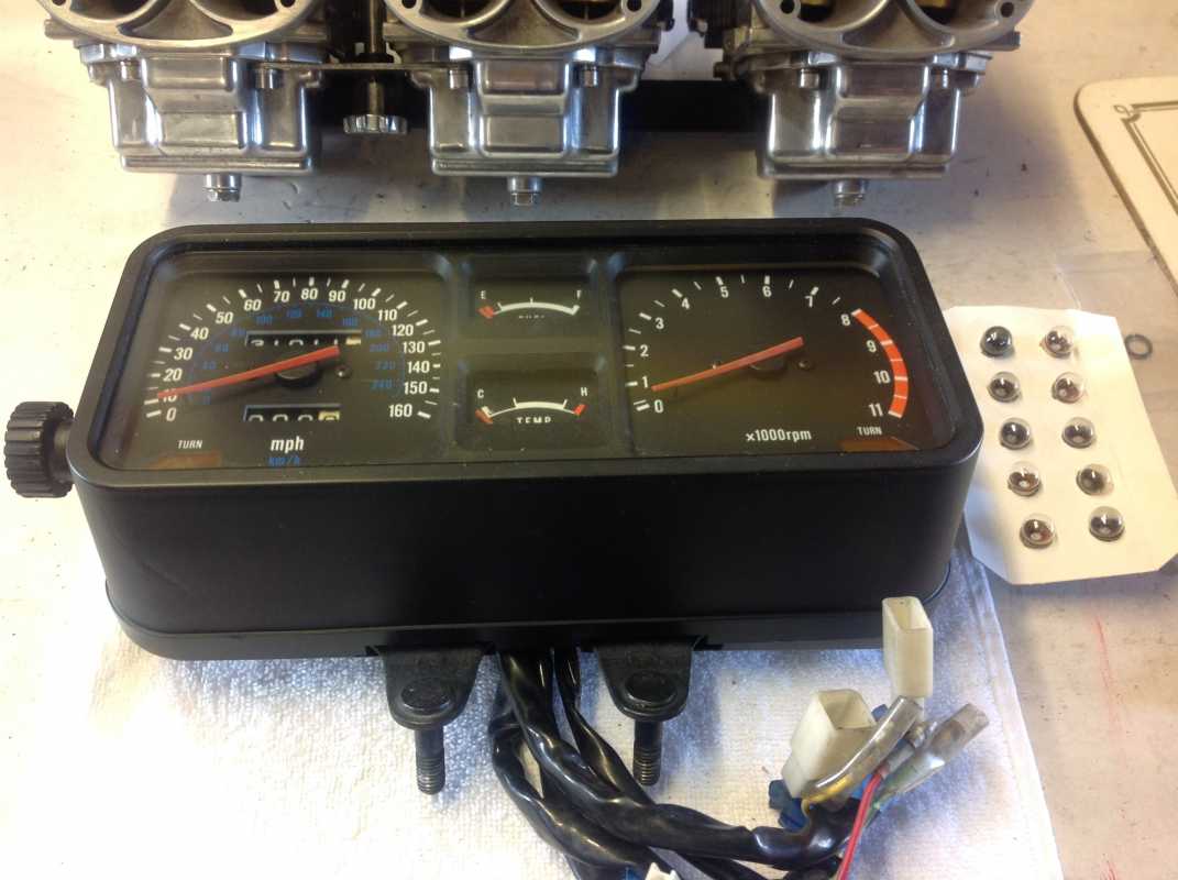 That's the speedo case finally finished. I couldn't get the original small round 4 W bulbs so I fitted the closest I could get. What I am not sure about is the length of the glass envelope- they are slightly longer than original and I am hoping that it does not put the hot bit too close to the coloured lens of the warning lights.