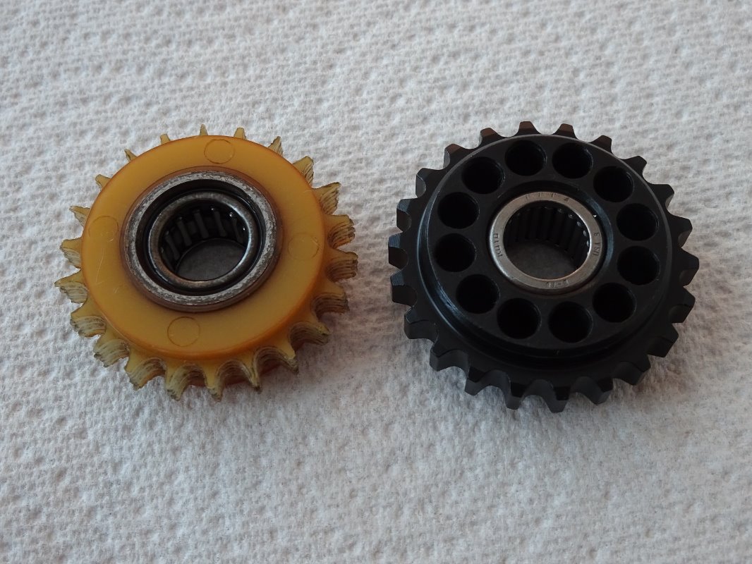 Comparing my old plastic gear with the new Liska unit, it is clear that my plastic gear is close to its wear limit. I also suspect that the wear on this gear is not proportional with mileage and once it starts to wear, losing the exact gear pitch with the cam chain, it will wear far more rapidly. I was always uncomfortable with a plastic gear in this location as it is load bearing and whilst it is a low noise solution and less expensive to make, I am much more comfortable with a more robust solution. For reference, I fitted the ZX-11 tensioner at around 24,000 miles and also shortened the spring by 10mm as recommended but I am sure this puts more stress on the gear. My gear is less worn that many posted on this forum but I still think it was time for replacement.