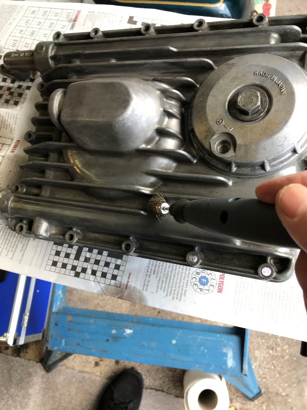 However, it was the renovation and paint work that took the most time. I have seen a number of comments on this forum about the pros and cons of re-spraying the engine either installed or removed. Removing the engine is no small undertaking and there is always the risk of damaging the paintwork during re-installation. I decided to re-spray the cylinder head after it had been removed – allowing easier prep and better access. I also brushed and cleaned the water outlet housing, timing/ignition pickup housing and sump but left them as bare aluminum as that seemed to be the original factory finish? The block and crankcases were prepped and sprayed in the frame and required a substantial amount of masking of the frame, top of the cylinder block, side covers etc. I am not sure the re-spray was any faster by not removing the engine as access for hard to get areas to prepare for painting is much more difficult and time consuming. However, preparation is everything when it comes to painting and I spent many hours with a brass brush, Dremel flex shaft and brass wire attachments and regular vacuuming to remove debris and cleaning with thinners.