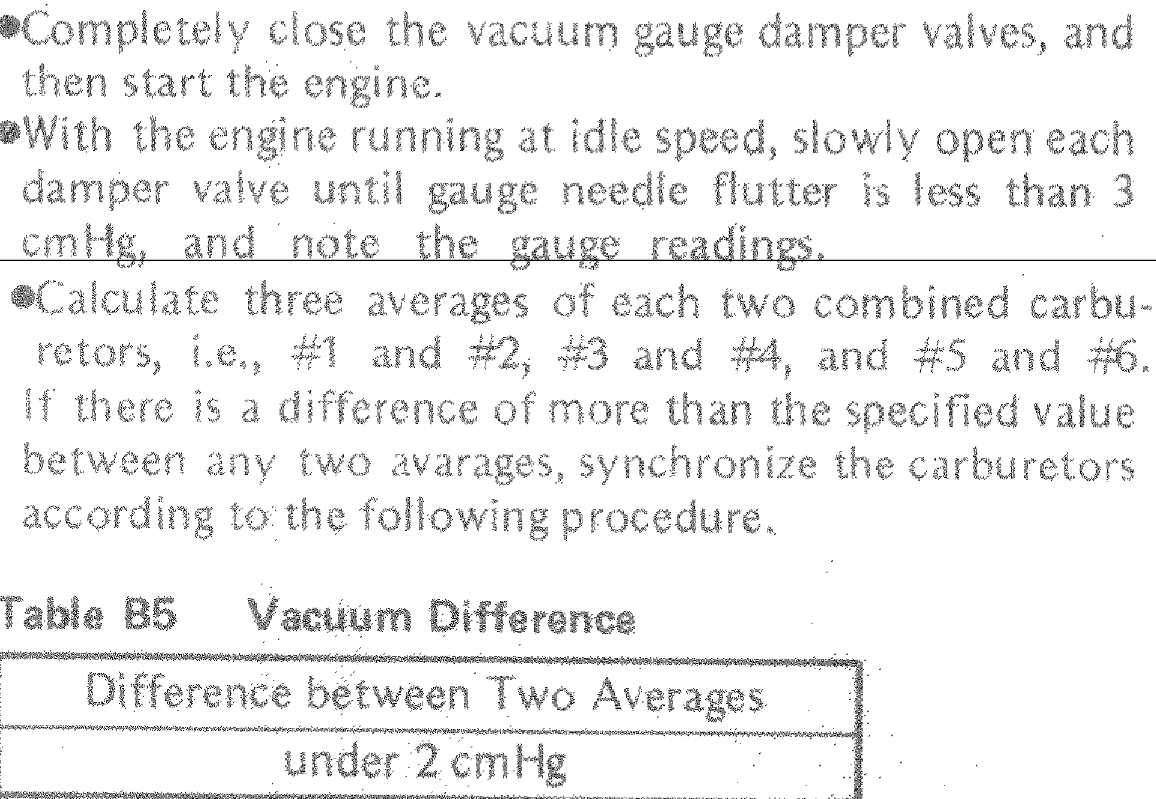An accurate sync is critical to ensure the carbs are working in harmony and achieving a smooth/consistent idle. If gauges are being used to sync. it's important to know they're accurate at the sync. range. Never mind if they don't read "Zero" exactly. What's important is that the 3 gauges read exactly the same at an arbitrary 8" hg. To determine this the 3 gauges must be manifold'd together to a common vacuum source and have 8" of vacuum pulled. Don't be surprised if the three read slightly different at the intended 8"hg! If there's any error in how they read at the intended range - you must take this into account when sync'ing! If you don't then the carbs aren't sync'd and if they're not sync'd...... well ...........?