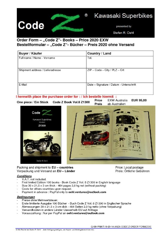 You might have noticed that there is not a single book on the market that deals with the beloved (K)Z1300. Well, that has changed, Stephan R. Oehl from Australia has compiled a lot of information around the bike in one book, Vol. 8 of his Code-Z-Series, and I could not resist to get one of the 100 copies.
