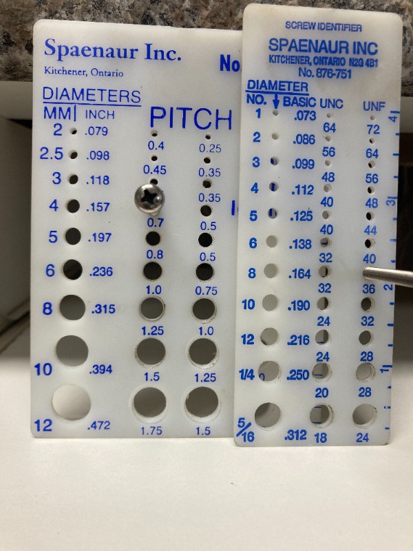 It is metric thread with Phillips head. M4 thread if i remember correctly, a longer screw can be cut to size. You should be able to find a distributor in US with metric size screws.