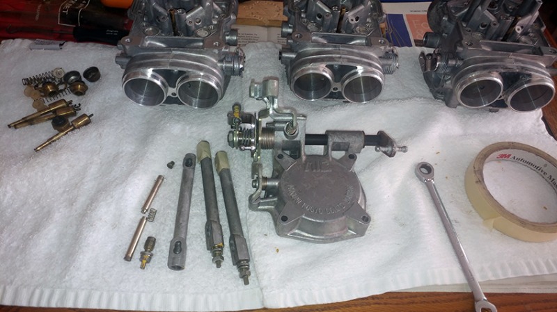 Stan. I'm looking at the pic of you linkages and am again compelled (lots of compelling this past week) to suggest you revisit your thoughts about leaving the main linkage shaft. Yes, the "Stacked" end must come apart but the '79 rebuild covers this Chinese-Puzzle . That heavy rust on the "ball-arm end" will wire-wheel off and with some of your profound elbow-grease, will polish (brighten-up) as will the other parts on the shaft. I know you'll polish the 3 link-rods!!!! For what it's worth I polish the internal parts too. I prefer to do everything I can to keep linkage drag to a minimum. The choke plungers should be polished lightly. No need to go crazy on these but a shiny stem and seal-end will allow the plungers to move freely with no drag, and this is important because the only thing keeping the choke-plunger seal against the seat is that one little spring (per choke). Wisely you've left the dust-cap on the plunger retaining nut !!!! Reading a bit further, you answered my Q about the diaphragms. Good to hear (by omission) that you're leaving the throttle-shaft seals, alone. The 2 steel throttle- shaft caps will polish.! A touch of wax now, and periodic cleaning will help keep the rust from returning on the steel pieces. The needle-valve bodies are giving your trouble? If after some soaking in a penetrating oil and some heat, they still won't budge - blow/wash out the P.-oil and soak that end of the carb-body (ONLY) in some lacquer-thinner. (Kawboy's laughing now - private joke!)