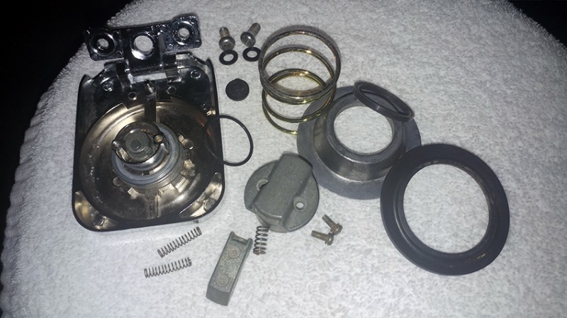 In the meantime, I took apart and cleaned the fuel cap. It was all plugged with rusty dry mud. Now all clean ready to assemble. Here a picture of what it looks like dismantled.