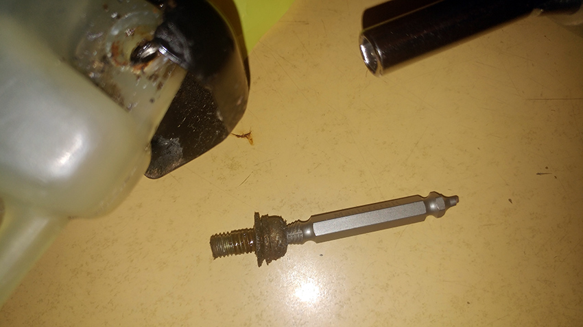 First I extracted the seized and damaged screw with a specialty screw extractor for damaged screws heads.