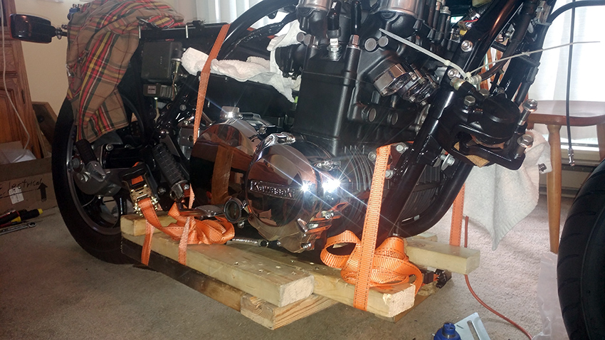 I need to get more straps, the caster wheels, a piece of very thick plywood, more long screws, and hopefully I will be able to lift the bike high enough with the little jack that I have to remove the wheels and set the bike safely on the dolly... kind of simultaneously. I also have to keep in mind the reverse process in the garage...