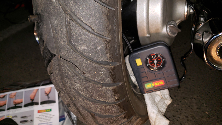 Pumping up the tire before trimming the plug. The puncture is in a bad spot, as the tire is not as thick inside the thread.