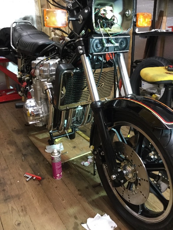 A bit more progress over the holiday but not as much as I would have liked due to coming down with some kind of virus. Anyway, feeling a bit better the last few days so decided to do a bit more on the bike. Exhausts fitted without too much of a problem and it was actually a shame to fit the radiator as it blocks the view of the six pipes which looks quite awesome without the radiator in the way. Radiator has been refitted along with new silicone hoses and new stainless grill. Radiator was painted satin black. That top clip proved a bit of a problem as if it’s not in the right position the clip catches the frame and stops the radiator from sitting correctly on the cushion. Was it me or the virus that had me struggling to locate it correctly. Probably the virus!!!!