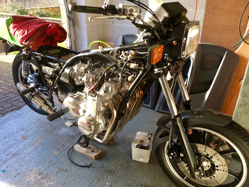 The current state of it. I have bought and modified a Predator 6 into 1 pipe and used a Black Widow end can. I fired it up the other day and it sounded way better than I thought it would. I leak tested the carbs again and squirted a couple of cc’s of petrol into each plug hole. It fired up first time. The radiator was left off to check the sealing of the exhaust, all was good.