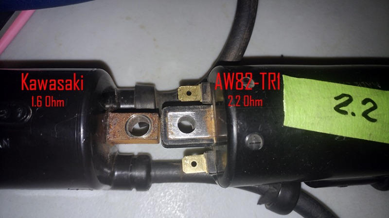 From what I learnt, using these coils, I will go within the 2.7 - 3.6 Ohm range calculated from stock Kawasaki coils and resistors as safe. My stock resistors show 1.7, the AW82 coils I have show 2.2. So 1.7+2.2=3.9 is too high. Alternative resistors should be used and I think 0.5 to 0.8 are a safe bet, but based on happy stories of members using 0.4, I will just search for good middle road and good value 0.5 - 0.6 Beru or similar resistors, having all three the same value. One coils shows 2.3 Ohm and I think it's negligible.