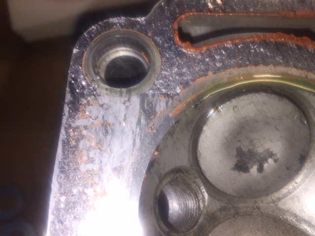 no need for liquid gasket when using a proper head gasket as it comes with its own 'soft coat', you can see from the pics that the extra (very thin!) layer of liquid gasket (in red) just squeezed everywhere it should not have gone