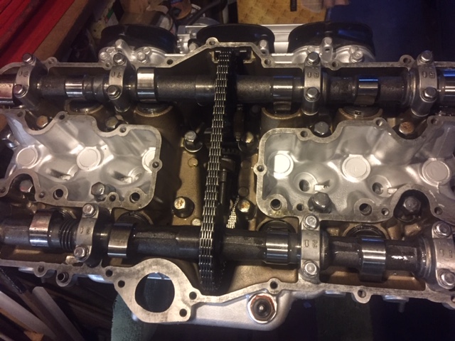 Ok, camshafts in and aligned with the timing marks 17 links apart. I also inserted the old tensioner just so I could turn the engine, but a new ZZR1100 one is coming next week (Kawasaki part number taken off the section on tensioners in the FAQ). I also managed to do the thermostat housing, and the head cover is on, but only loosely.