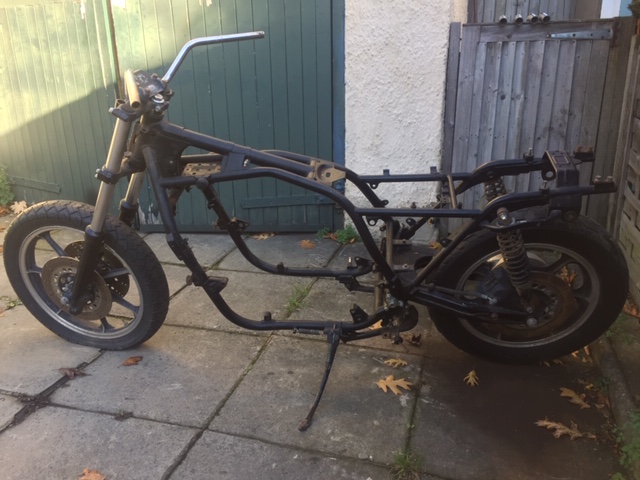 The frame is in excellent condition, but depending on what the final product needs to look like, be stripped of all brackets that are no longer needed, and other bits may be cut off/welded on. I am currently thinking of fitting Ohlins upside down front forks with uprated brakes, and depending on the length of the forks and the new arrangement on the rear suspension, may need to adjust the triple tree arrangement.