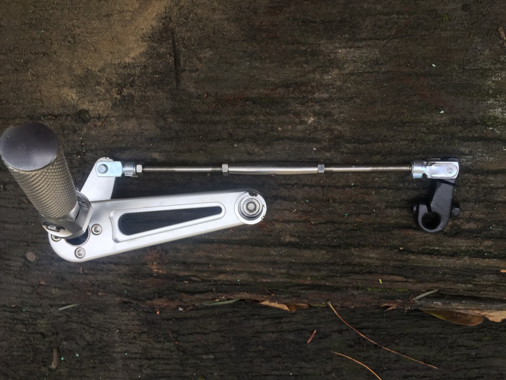 The rear set gear connecting rods arrived and I mocked it up with the gear cam lever that I fashioned out of an old Triumph brake lever. It became very obvious the side stand was going to be in the way, so I bit the bullet and took the engine out. As I now know how to do it and what to look for, it took about 45 mins, no extra damage to paintwork. The engine is now back onto a pallet and needs a thorough clean as all the shavings from all the metal grinding, cutting and welding I have been doing are all over it.