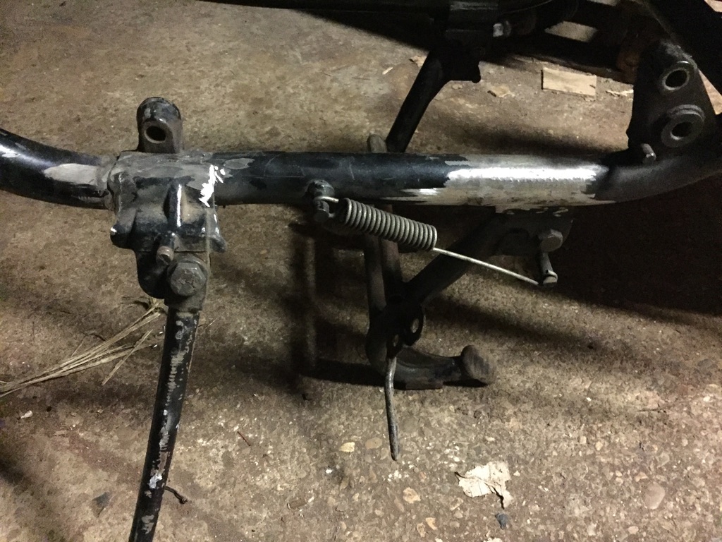) and cut the side stand bracket from the frame. It is a half-moon welded at only the top and bottom, so easily done and easily re-welded approx 26cm forward, right opposite the forward bottom engine mount. I still need to fine-tune the angle by bending the stand itself slightly, but it is incredibly strong, so will need heating. I will not cut off the centre stand brackets as there is no need. I can just remove the centre stand when I want and put it back on should I need it.