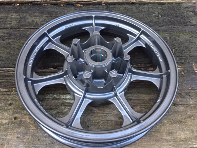 In the meantime, the powder coater has managed to powder coat the rear wheel in the same shade as the new front wheel - anthracite grey. Looks great! Ready for new wheel bearings and brake disc.