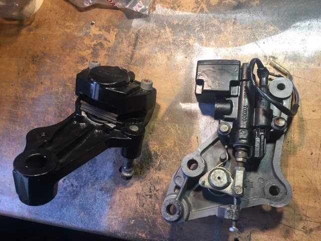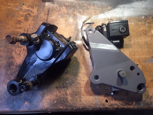 Rear Brake caliper, shot blasted, powder coated with new piston rubbers, ready for installation, alongside the refurbished MC plus mounting plate.