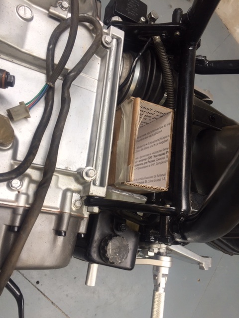 The battery and the digital fusebox will go into a small box between the swing arm and the engine block. I mocked it up using a card board box..