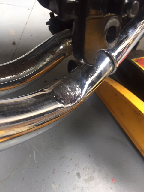 Yes, I bashed the pipe in to get round the side stand bracket which I obviously welded a little too far forward - but how was I to know? Of course I know now for the next time, and for this bike I will get a completely new system anyway.