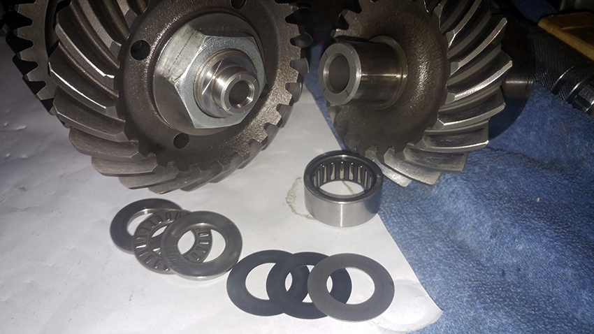 Inner driven shaft needle thrust bearing and shims quick reminder: smaller diameter inside (towards the gear), larger outside, (lettering goes outside of course), closed face of the bearing inside, open face out, fine tune shims and a the thick stopping shim last to the crank case. (not sure what the proper names for these are but works for me).