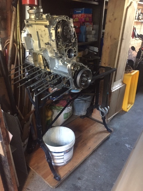 Attached pics of the engine on its side on the table frame, on a plank on wheels... The benefit of teh frame being that I can turn the engine over without having to remove the cylinder studs (which I can't get out).