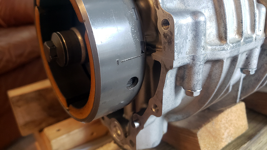 The #1 and #6 pistons are at the top dead end. The crankshaft is in position - the 'T' aligned with engines mating surfaces.