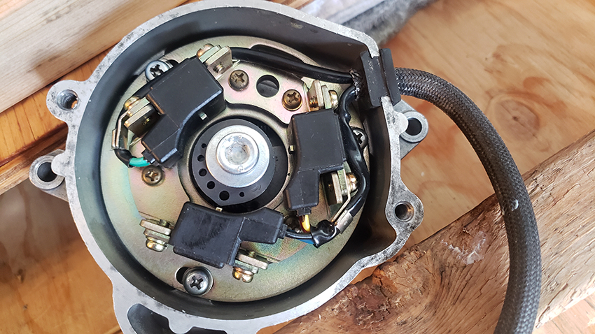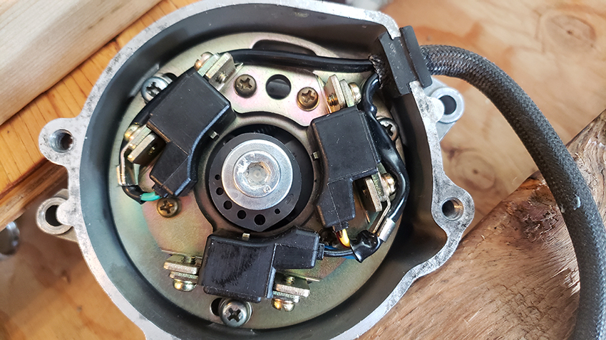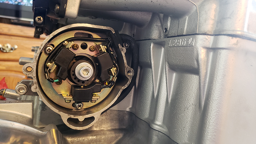 Timing advancer set first to 'F' aligned with the dot. The picture shows where the timing rotor should be by the manual. In this case, the projection was actually a tiny bit counterclockwise. I haven't touched the three mounting screws. Thinking it was taken off a running engine, for now I am leaving it as is.