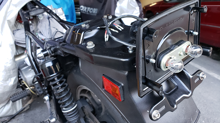 The correct tail light bracket fits like a glove! It was as easy as attaching it. Proves how handy is to have spare parts and sub-components ready. 0f course, work was done on them earlier: all media blasted, etched, painted, the electrical components cleaned and checked, the light bulb sockets got a light coat of dielectric grease where applicable for smooth action and protection.