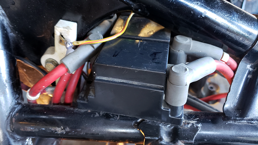 Speaking of which - a couple pics of the other side of the coils. You can see the resistor. I have no idea yet about any particulars pertaining to this set up, as I'd like to sort out all the mechanical issues first (engine, brakes, etc.), then do as much as I can replacing the aftermarket parts with stock. At this point it will be the front end (headlight, controls, etc. ). Then - in a few short weeks I should be getting the brackets from Paul. They will go on the frame (I am planning on buying a small welding machine and doing the welding myself - it's never more than one inch at a time so I might be able to get away with it), and then I'd mount all the electronics in place. From that point I'd plan wire connections and would start reverse engineer what's there now.
