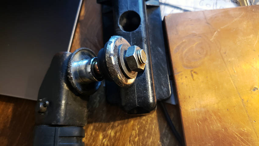 Took a closer look at this right foot peg. The bolt there was used to secure the 6-1 exhaust, the peg bracket and the peg together. This setup does not exist in real world of stock KZ1300. But wait a minute... These two chrome collars, and the rubber, resemble something! That's right - these are turn signal collars and a damper.