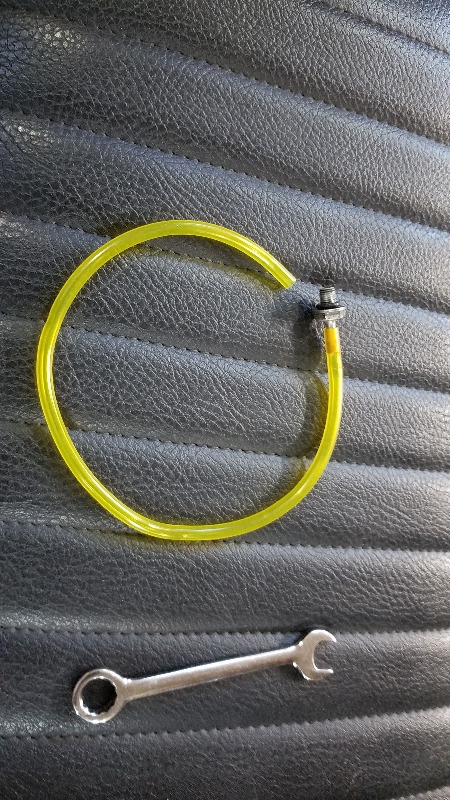 Thanks for those links Guys. I'll order some drain screws from Kawasaki. In the mean time, I drilled out a drain screw from one of my spare carb sets and soldered a piece of 1/8" copper tube into it thus: