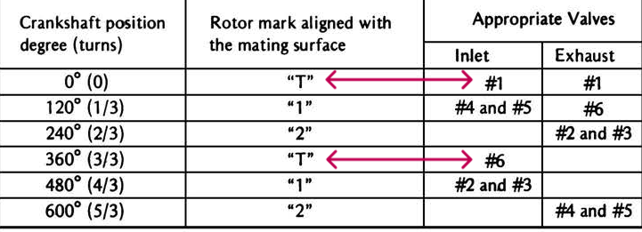 So It doesn't matter if the "T' on the crankshaft is at cylinder #1 compression or cylinder #6 compression because the ignition is a wasted spark ignition. The pulser coil shaft rotates at crankshaft RPM and every time the "T" mark on the crankshaft comes into alignment so does the "T" mark on the pulser coil. Cylinders 1&6 fire simultaneously as does Cylinders 2&5 as does cylinder 3&4. The ignition has 3 pulser coils triggered by 1 tit on the pulser coil rotor. Each of the pulser coils fires one of the ignition coils via the igniter