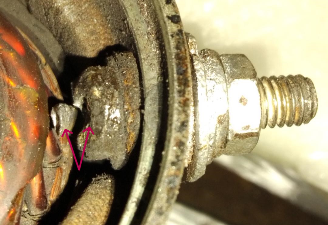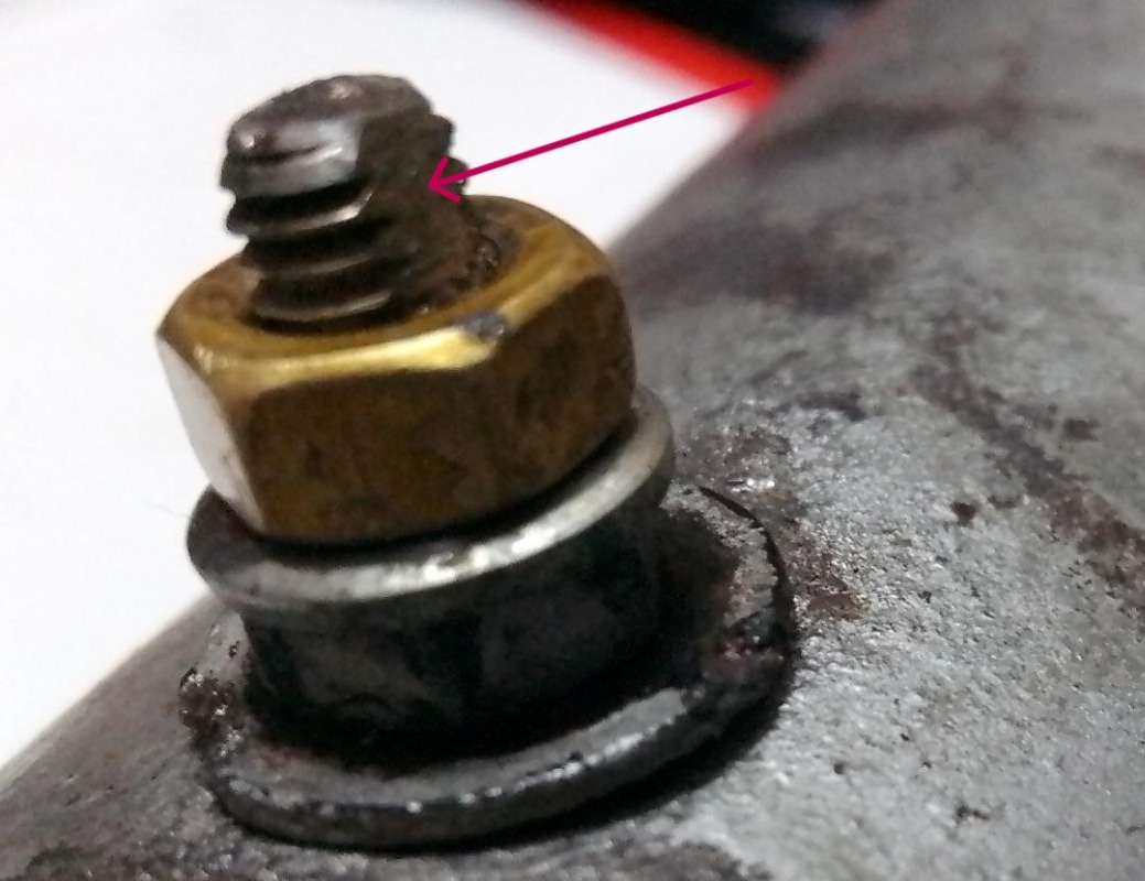 The screw has been filed so that it can be held with a wrench while the nut holding the power cable connector is tightened.