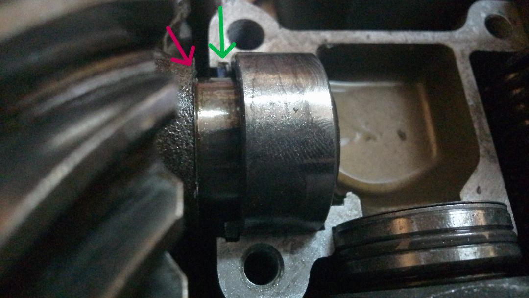 The red arrow shows signs of the shaft rubbing against the bearing as it is not in its correct housing.