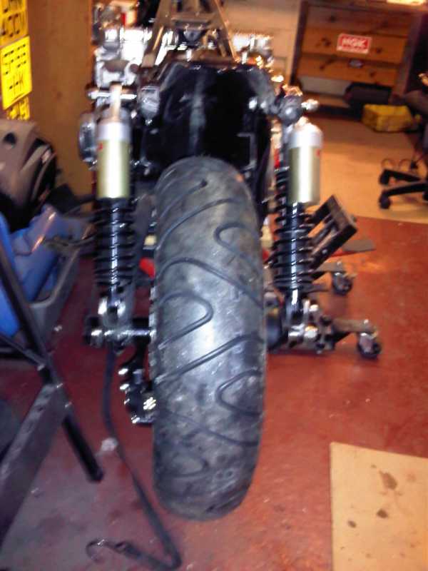 I wanted a larger rear tyre & to reduce the size of the front wheel to make it a little more sure footed into corners so fitted a Vmax diff which allowed me to fit an 3 spoke XJ900 Diversion rear wheel with a 160 section rear tyre. As the Vmax diff is on the other side of the bike, adjustments had to be made to fit it to other side of the Z1300 including swinging arm work & fitting the diff upside down. The bike is now 4 inches longer than standard. Then to make the back end really good I then fitted gas assisted ZRX1200R shocks. This can all be seen in the images below.