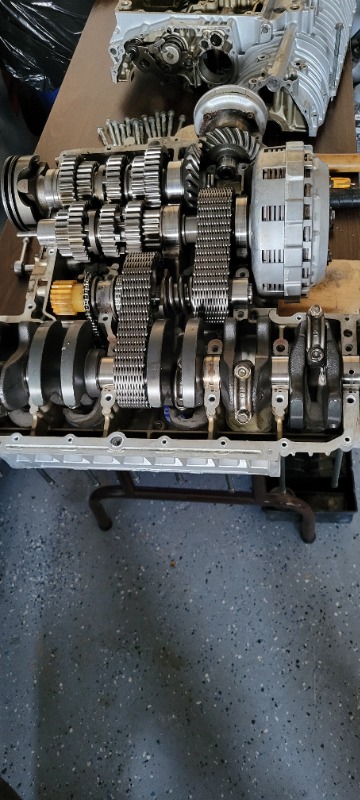 So, engine was in the frame at 7:30 and at 1:30 the engine is split and final measurements of the slack in the primary and secondary chains is done.