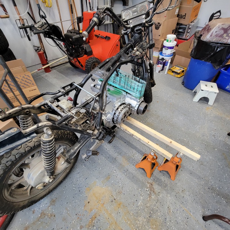 So, easy peasy - engine's on the table, 2 x 2 pine laying across the frame rails and set up on jack stands. Just lift the engine off the table ( Brute force and ignorance, or maybe better put, just pick it up and move it because , well, I'm only 69 years old and not dead yet) and place on the pine rails.
