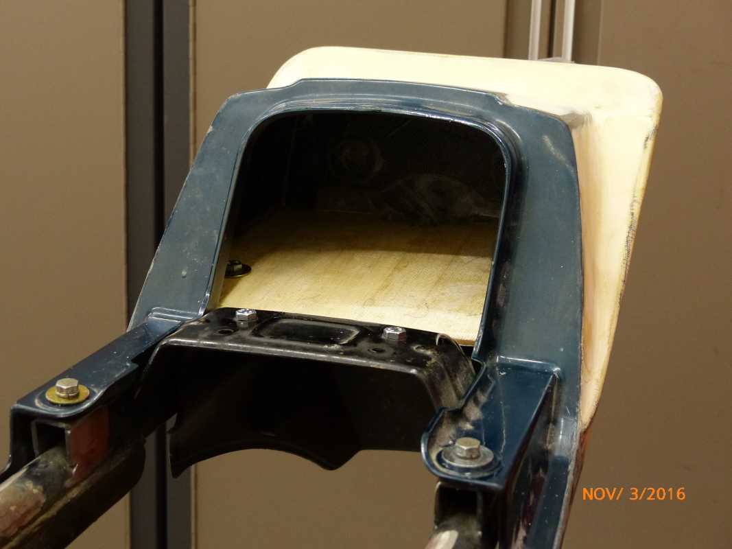 In one of the previous posts "Trikebldr" commented on my glass work and suggested that I glass in the storage compartment and ditch the tiny plastic tool box. So it's his fault that I did it. I built the floor of the compartment out of 3/16" balsa wood sheeting and epoxy glassed both top and bottom then fitted it into the tail section and epoxied it in. Than I glassed in the rear of the tail section and that created a sealed in tail section. The tail section is so rigid that I was able to eliminate the 2- 6mm bolts in the back of the section which bolt to the rear light bracket. Now there is 4 bolts holding the tail section to the subframe.