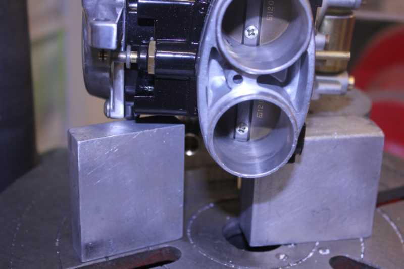 2) Block-up the carb-body solidly so one hand can hold it securely. I used a drill-press. Hand-drilling should work satisfactorily.