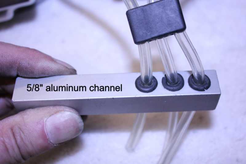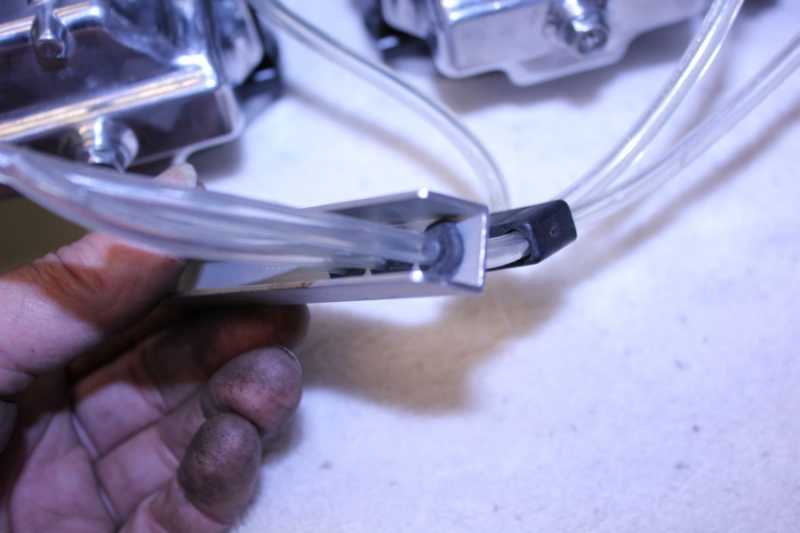 4) Using a 1/8" bit for 1/8" tubing gave me a loose fit. This was desirable so the tube would have an epoxy coating inside the hole. Additional epoxy was used inside the body for strength, and I believe is required. Note the left and center carb drain is angled forward. This was strictly for esthetics to minimize the "clutter" under the carbs.