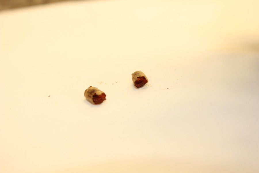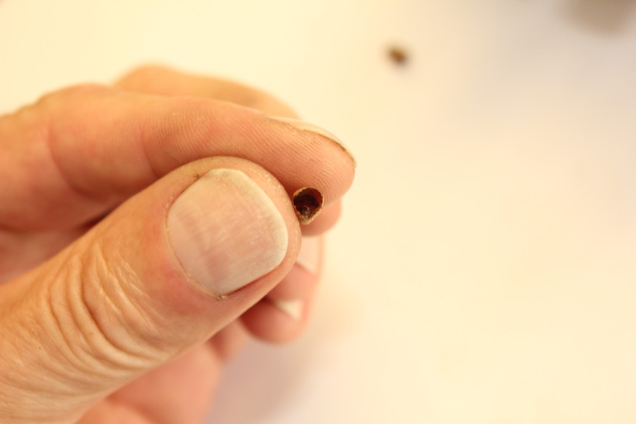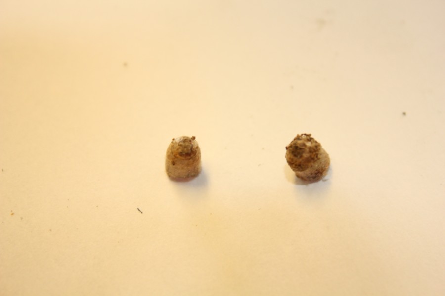 After giving these carbs a preliminary cleaning a "function" inspection determined that the air-bleed on one of the bores and on two individual carbs was blocked. The "function" inspection is nothing more than blowing air through the various passages to ensure they're clear. A visual inspection with a high intensity light looking into these air-intakes for these bleeds discovered these strange objects. They blew-out by applying air-pressure "backwards" through the appropriate port elsewhere. What came out are pictured below. My first impression was that they were from residual sealant applied to the metering jets, (deep in the passage) during the assembly of the carbs. Upon a closer look it was obvious that the ends were completely formed closed (directly over the metering jet). This would have made a successful flow-testing(?) of these carbs at the Mikuni factory impossible. Presumably each bike would have been run through some tests to ensure that they would indeed run, before shipping from the Kawasaki plant. The bike would not have run correctly.