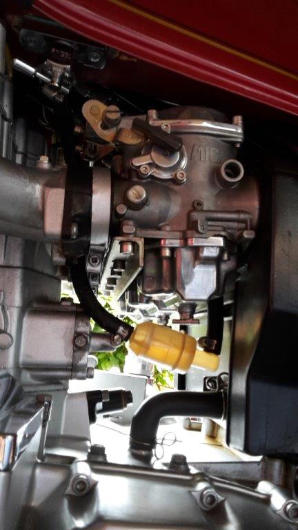 Herewith picture of my routing. Although it routes under the carbs to the T, I have had no problems with "vapour locks" and fuel starvation at high speed. I have a Pingel Hi Flow pet cock, 8mm fuel hose and a hi flow filter and have removed the electric solenoid valve as seen in the pic and never had a problem. On a recent rally in Zimbabwe I hammered the old girl for about 50km's at 190 - 210kph non stop, much to the amazement of others with no hassle or fuel starvation!